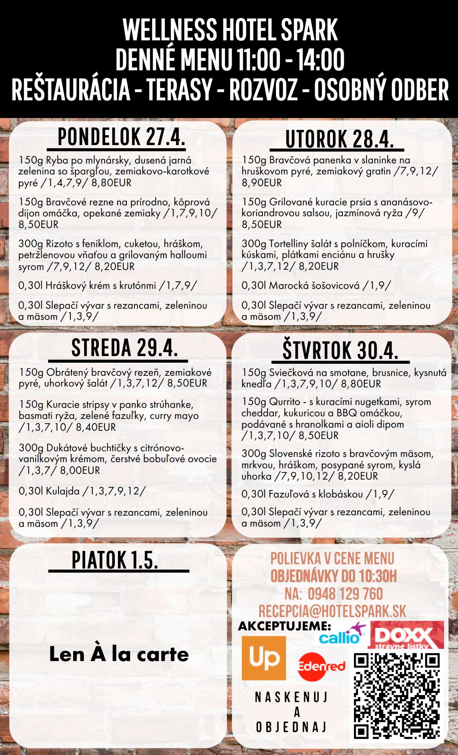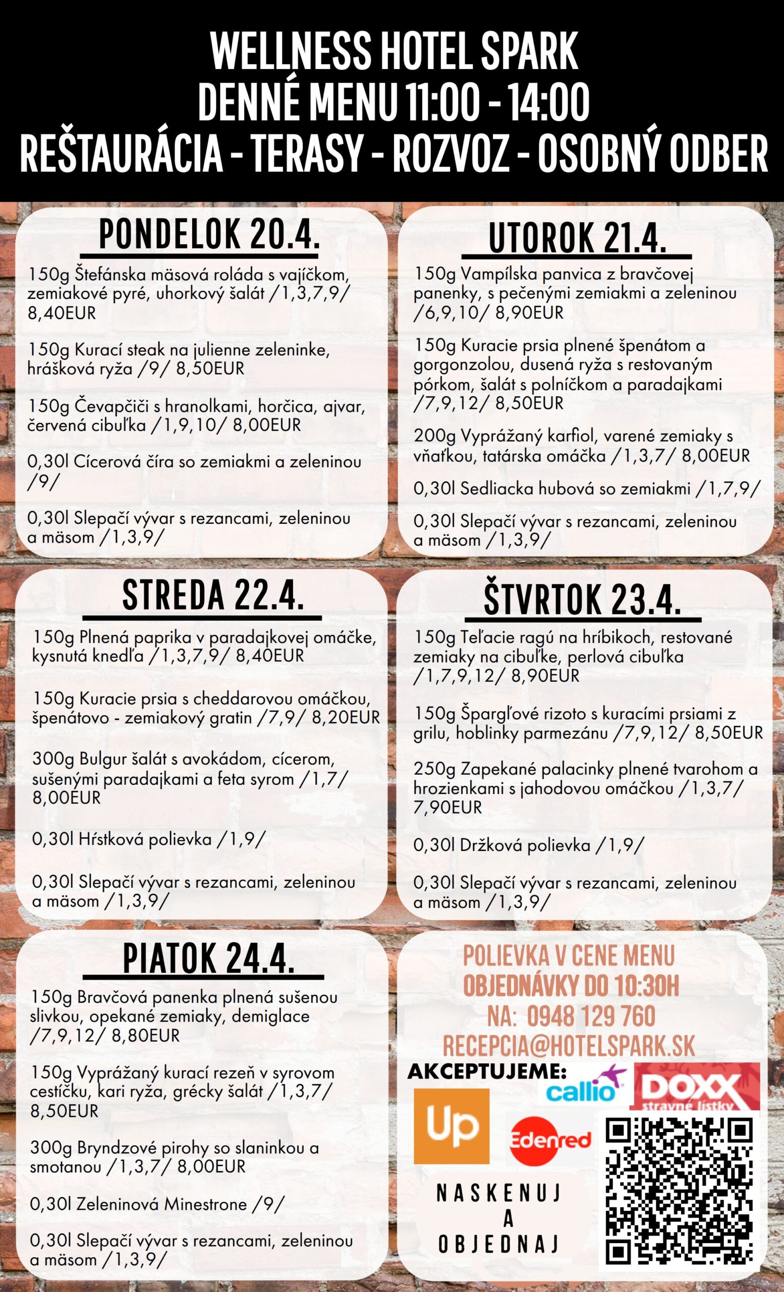 Jedlo si môžete objednať na tel. č.: 0948/129760, 034/7746203, recepcia@hotelspark.sk, alebo priamo online, kliknutím na tlačítko nižšie: